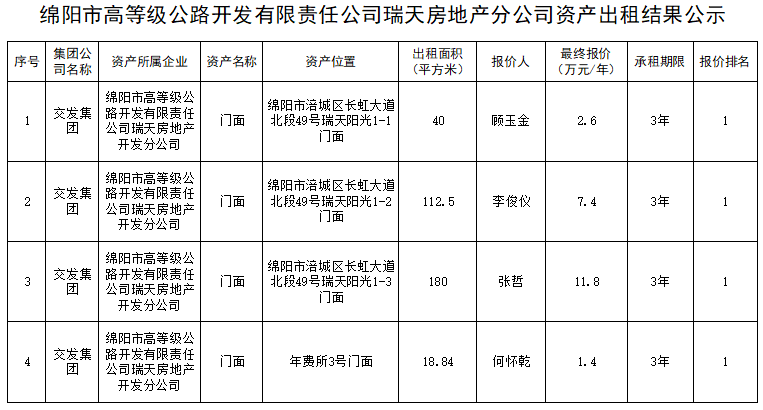 綿陽(yáng)市高等級(jí)公路開發(fā)有限責(zé)任公司瑞天房地產(chǎn)分公司資產(chǎn)出租結(jié)果公示